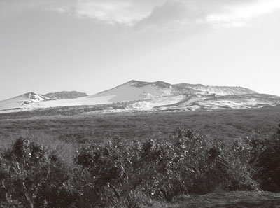 | 北から見た雪景色の伊豆大島火山三原山と山頂カルデラ.三原山 左には櫛形山から白石山に連なる西部カルデラ縁.三原山北側斜面 最上部に1986B火口列,そこからLB溶岩流が流れ下っている. |