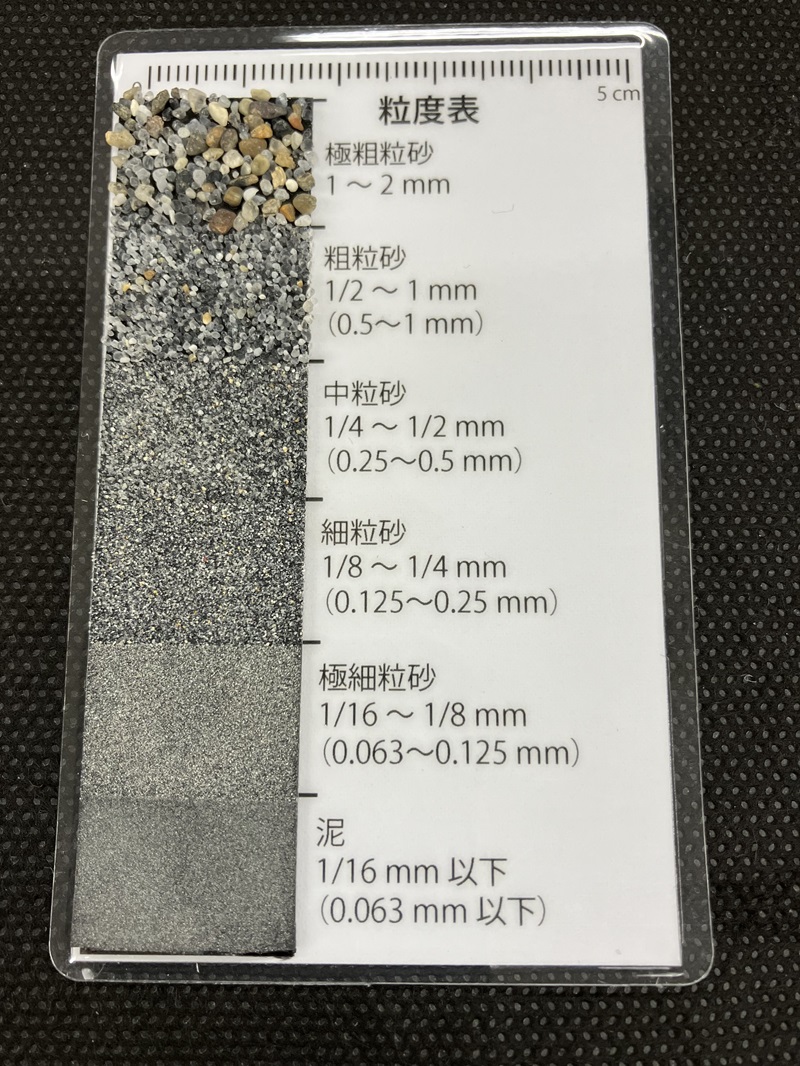 (※)粒度表とは、砂の粒径の違いを簡単に比較できる便利ツールです。砂を粒径ごとにふるい分けて台紙に貼り付けてあります。GSJの研究者も地質調査の現場で使用しています。