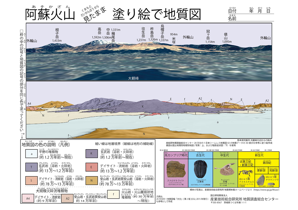 トップ 遊んで学ぼう!地質 塗り絵 阿蘇火山 ( あそかざん ) くまもと だいかんぼうから見たまま 塗 ( ぬ ) り 絵 ( え ) で地質図 阿蘇火山 ( あそかざん ) くまもと だいかんぼうから見たまま 塗 ( ぬ ) り 絵 ( え ) で 地質 ( ちしつ ) 図 熊本県(くまもとけん)のシンボルの阿蘇山(あそさん)(火山(かざん))を北側(きたがわ)の外輪山(がいりんざん)にある大観(たいかん)峰(ほう)付近(ふきん)からカルデラの中(なか)の火山(かざん)を見(み)みた風景(ふうけい)です。 好(す)きな9種類(きゅうしゅるい)の色(いろ)を決(き)めて塗(ぬ)り分(ぶん)わけてみましょう。 山(やま)の絵(え)の中(なか)なかに書(か)かかれた文字(もじ)と左下(ひだりした)の枠(わく)の中(なか)の同(おな)じ文字(もじ)のある部分(ぶぶん)は同(おな)じ色(いろ)で塗(ぬ)ります。できた年代(ねんだい)の古(ふる)いものから塗(ぬ)っていくと山(やま)のでき方(かた)がわかりやすくなります。 ダウンロードする (pdf:1.5MB) 塗(ぬ)り方(かた)の参考(さんこう)例(れい)