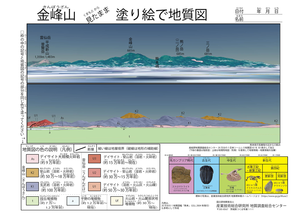 トップ 遊んで学ぼう!地質 塗り絵 金峰山 ( きんぼうざん ) くまもとから見たまま 塗 ( ぬ ) り 絵 ( え ) で地質図 金峰山 ( きんぼうざん ) くまもとから見たまま 塗 ( ぬ ) り 絵 ( え ) で 地質 ( ちしつ ) 図 熊本市(くまもとし)のシンボルの金峰山(みたけやま)を東側(ひがしがわ)にある熊本県庁(くまもとけんちょう)付近(ふきん)の高(こう)い階(かい)にあたるところから見(み)みた風景(ふうけい)です。有明海(ありあけかい)を挟(はさ)んだ雲仙岳(うんぜんだけ)も見(み)えています。 好(す)きな9種類(きゅうしゅるい)の色(いろ)を決(き)めて塗(ぬ)り分(ぶん)わけてみましょう。 山(やま)の絵(え)の中(なか)なかに書(か)かかれた文字(もじ)と左下(ひだりした)の枠(わく)の中(なか)の同(おな)じ文字(もじ)のある部分(ぶぶん)は同(おな)じ色(いろ)で塗(ぬ)ります。できた年代(ねんだい)の古(ふる)いものから塗(ぬ)っていくと山(やま)のでき方(かた)がわかりやすくなります。 ダウンロードする (pdf:1.2MB) 塗(ぬ)り方(かた)の参考(さんこう)例(れい)