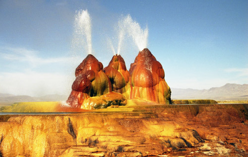 これは温泉の湧出に伴って生成された円塔状の温泉沈殿物で,一般的には噴泉塔と呼ばれる.ガイザーズと命名されているが,間欠泉ではなく,絶えず温水を放出している.この噴泉塔は米国ネバダ州リノ市の北方約150kmの荒野の中にある.これは自然にできたものではなく,1964年にウェスタンジオサーマル社によって掘削された地熱井から漏出した温水が偶然にも造り出したものである.噴泉塔の褐色や緑色は,バイオマットをつくる好熱性藻類に起因している.噴泉塔の色合いと青空が見事なコントラストを示していて,荒野に花開いたオアシスのようである.