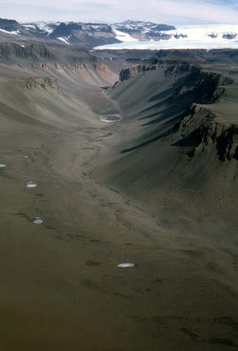 南極にはめずらしい氷のない谷があり,フェーン現象による無氷谷が広がる.そのひとつのライト谷奥部には全く音のない谷と水分の濃縮された塩湖(池,径300m)がみられる.この奥の方遠方は南極の大氷原が広がる(ヘリコプターより).
