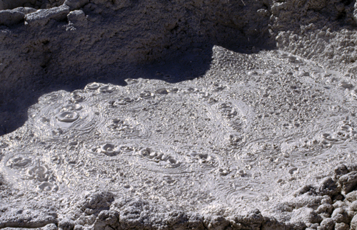 地下水位の低下や水分の蒸発が進むと,水に対する懸濁物の濃度が増して,どろどろ状態になる.こうなるとガスバブルは湯沼全体をかき混ぜることができず,泥沼の中に,相対的に透水性の低いブロック(温度が低く粘性も高い)ができる.バブルはそのブロックの隙間を狙って上昇する.バブルが上がるところでも粘性がかなり高く、泥水というよりペースト状態.“バブルの波紋”は残像となって連なり,バブルの通路が脈状であることを鮮やかに示している.火山に例えると,“割れ目噴火”の状態.