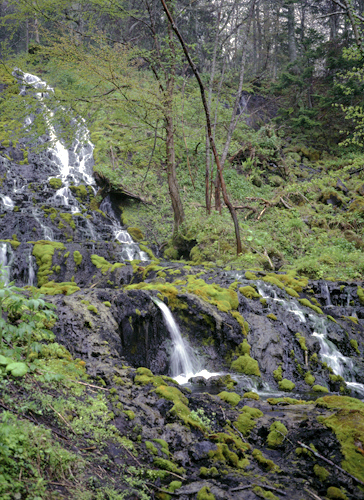雌阿寒岳の安山岩質火山噴出物の末端に源を発する温泉水(泉温〜43度)が,大気を巻き込みながら落差50mの急斜面を流れ下る.河床は,二酸化マンガンの沈着により真っ黒になっている.火山噴出物から雨水で溶かし出されたMn2+が,マンガン酸化細菌により酸化された結果である.ここには,かつてマンガン鉱山として採掘されるほど大量の二酸化マンガンがあった.