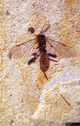This is a fossil insect sawfly, Hymenoptera. Its wing and sting morphology implies that this insect is classified into female of ichneumon flies: Ichneumoidea, which lay an egg into an worm body with her sting for parasitising worm, not for stinging human or mammals.This specimen was collected from the mudstone of Shiobara Fossil Museum, Tochigi Pref. This site yields abundant and many kinds of well-preserved fossils, i.e. insects, spiders, leaves, flower, fishes, frogs and mice. Therefore, Shiobara is ranked as a well-known fossilsite. Most of fossil insects, however, have not yet been described. This insect has also not yet.Under permission of Kato Nobuo, the director of the fossil museum. Width of this insect is ca. 2cm.