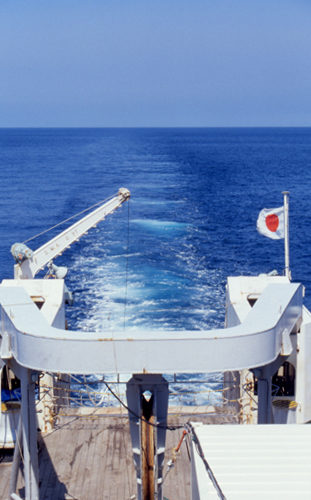 船尾から伸びる航跡の泡にまじって,白い泡がかたまりになっているのがいくつか見える.これは圧縮空気が開放されて海面に浮上したものである.産総研 地質調査総合センターでは日本周辺海域の地質構造を明らかにするために音波探査を行っており,音源に圧縮空気を用いている.左のクレーンから音源のエアガンを曳航し,開放された白い泡は,断続的に航跡のあとを追っていく.
