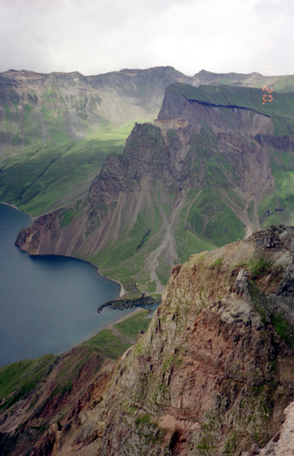 長白山は中国/北朝鮮の国境にある最高峰(海抜2749m)の火山である.雪解け水は中朝国境を流れる大河,鴨緑江・図満江へと注ぐ.この火山は新第三紀末から第四紀に苦鉄質アルカリ岩,更新世に珪長質アルカリ岩が噴出して,主要部が形成された.近年の活動は,B.C. 2155年の火山円錐丘の形成,A.D. 1215 ±15年に我が国へ2-5 cmの降灰をもたらした大規模な火山灰噴火, A.D. 1668-1702年, 1903年などの小規模噴火などである.火口は現在は火山湖(海抜2194m)を形成し, その北側には長白山温泉群,長白瀑布などがある.