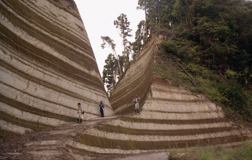 The turbidite succession usually comprises the rhythmical alternation of turbidite sandstones with deep-water mudstones, and often makes an artistic impression. The picture is the Quaternary turbidite succession observed along a forest road in the Boso Peninsula, central Japan.