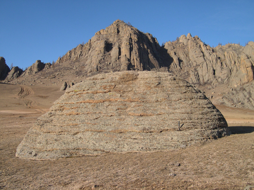 モンゴルの大草原から突き出た高さ2mにも満たないこの花崗岩に,地表面から薄板を平行に積み重なたような縞模様が見られます.この縞模様は地表面に平行に形成されている割れ目です.このような割れ目は,専門用語でマイクロシーティングやラミネーションなどと呼ばれ,花崗岩山地における災害の潜在的な地質素因として最近注目されています.