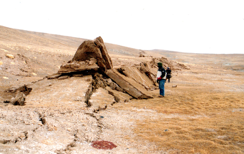 2001年崑崙地震(Mw 7.8)によって形成されたプッシュ・アップ構造(モール・トラック).このプッシュ・アップ構造の高さは約2-3mである.