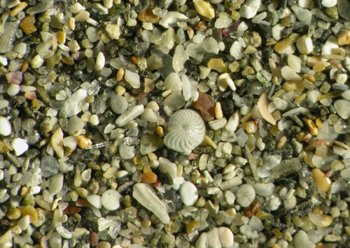仙台市の七村さんから寄贈された南三陸のリアス式海岸の浜砂を実体顕微鏡で覗いて見ると,径0.1〜0.5mmの分級やや良好な美しい細〜中粒砂.南国のものと錯覚するような砂の中に,アンモナイトを連想させる美しい有孔虫の殻(長径0.8mm)が点在していた.この美しさは親潮の海の豊かさそのものなのだろう.(画像の倍率は60倍・中央の有孔虫の殻の長径が0.8mmである).