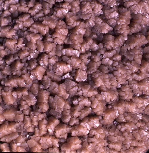 北投石は,胃の検査のときに飲むバリウム(硫酸バリウム)からなる重晶石という鉱物のうち,少量の鉛を含み弱い放射能を示すものです.玉川温泉では,温泉からの沈殿物としてこの鉱物が見られます.普通は層をなす塊として産しますが,この写真のような結晶が見られることもあります.現在国の天然記念物で,採取は許可されません.地質標本館標本.