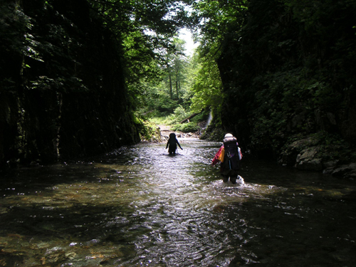 梅雨明けが近づき,ひさしぶりに夏の日差しが降り注いでいた.我々は3日分の食料を背負い,水量の多い河原に降り立った.装備を身につけ,上流へと歩きはじめると,広々としていた河原は両岸が切り立ったゴルジュとなった.ゴルジュの両岸は垂直に切り立っており,まるで廊下のようだ.太陽の光が差し込まない薄暗いゴルジュを進むと,やがて先行者のシルエットが浮かび上がった.ゴルジュの先から光が差し込んでいるのだ.私はこのゴルジュを「光の廊下」と名付け,シャッターを切った.