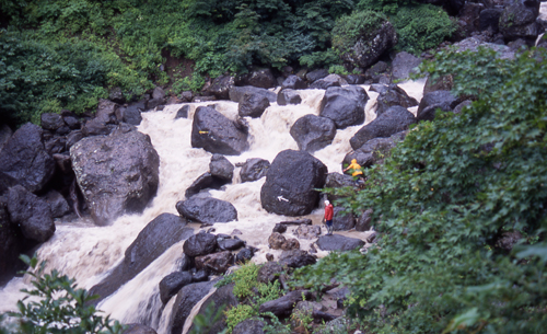 雨で増水した海谷渓谷の渡渉地点(写真1).矢印の方向へ進むのが正規の登山ルート.その後3日間待ったが減水せず,他ルートへ転進した.