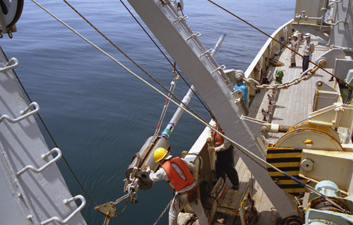 題名:コアラー(柱状採泥器)の投入