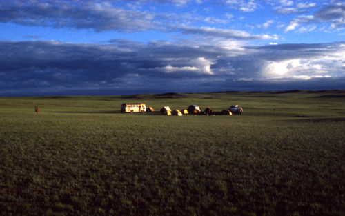 モンゴル西部バヤホンゴル地域にあるサウス斑岩銅鉱徴地の調査風景.道路も人の居住地もない草原での調査のため,テントを使用している.起伏に乏しい地形のため道路がなくてもバスでの移動も可能である.キャンプ地背景のやや盛り上がった部分が二畳紀の花崗斑岩の露出地域で銅・モリブデンの鉱染を受けている.モンゴル人の習慣(中国に対する警戒感)からテントの入口は南に向ける.