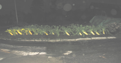 新潟県川口町では震度7となり、最大加速度は1000galを超える地点もみられた。中でも田麦山地区は扇状地上で多くの家屋に被害があった。写真の大根はこの加速度によって抜け上がり傾いている。2004.11.29撮影。