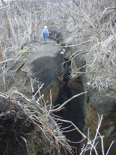 雨に流されて泥流となった三宅島の火山灰は、林道を流れているうちにその表面を次第に堀りこみ、こうして形成したガリーの深さは数mに達している。これを飛び越えて行く観測点もある。2004.3.13撮影