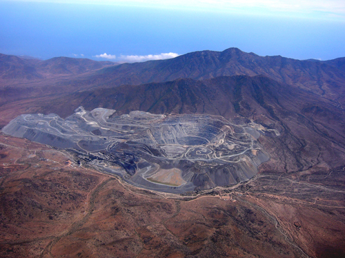 南米のチリは世界一の銅生産量を誇っており、2004年は約490万トンの銅を生産しました。そんな銅資源は、斑岩銅鉱床と呼ばれるところから採掘された銅鉱石を精錬することによって得られています。写真は、航空機から撮影した巨大な採掘現場です。すり鉢状に掘り下げられた形状が特徴的ですね。2004.11.9撮影。
