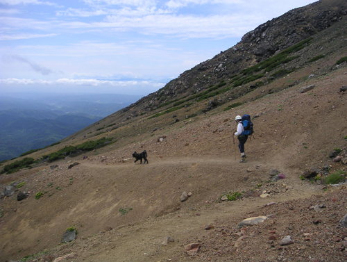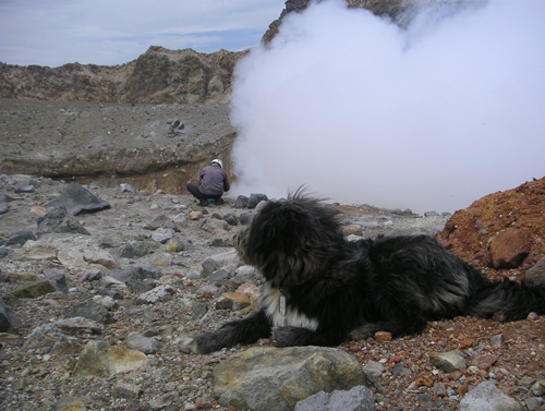 雌阿寒岳96-1火口付近での噴煙観測を監督中(?)の“野中モコ”。野中温泉の看板犬の一匹です(A)。登山客と毎日のように登り、ガイド犬見習い中(?)。帰り道では我々を引率してもらいました(B)。2006年の噴火以降は登れなかったようですが、入山規制も解除され、また元気に登山しているに違いありません。