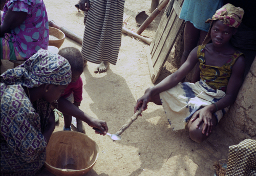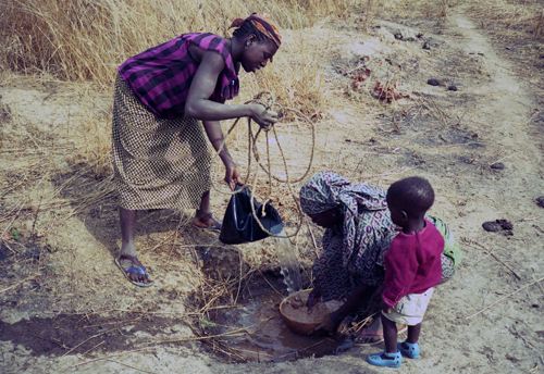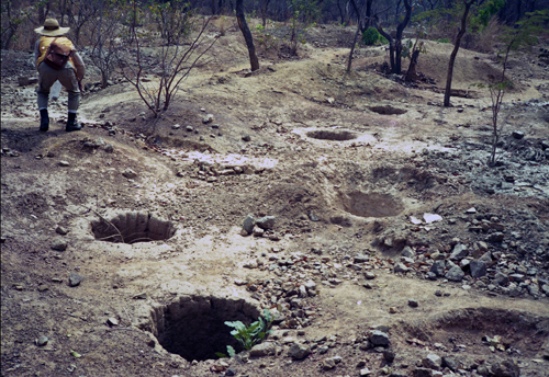 西アフリカ、マリ共和国は9〜15世紀アフリカ大陸における一大産金国であった。産金鉱床の大部分は、ラテライト下に伏在する河川堆積物からなる砂金鉱床である。地表から数m間隔で縦穴を掘り(A)、砂金鉱床に到達したところで、横方向に採掘層を広げていく。含金土壌は近傍の河川水を用いてパンニングされる。この採掘方法は、現在も基本的には変わらない。一般に男性が採掘を行い、女性がパンニングを行う(B・C)。採掘規模は集落単位から2-3名のものまで様々である。水確保のため、採掘は雨期に行うことが多い。採掘された砂金は、地方をまわるブローカーによって個人レベルで売買される。買い取り価格は実勢レートに近いものであった。このように採掘された金がどの程度、市場に流れるかどうかは不明である。写真は、マリ南東部の砂金採掘を生業としている集落で撮影したものである。乾季であったため採掘は休止しており、パンニングをお願いした含金土壌も昨年堀り上げた残土を用いた。洗い出された砂金の水分を集落に戻ってから蒸発させているものである(D)。