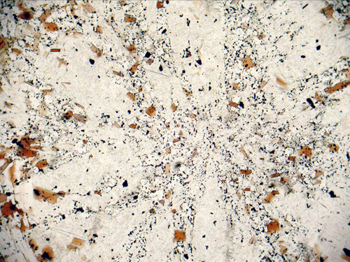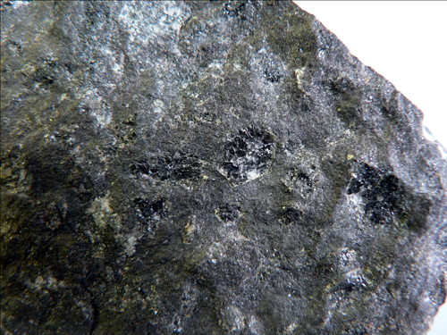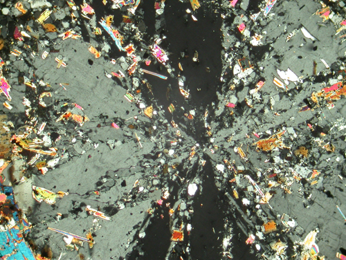 題名: 菫青石ホルンフェルスの手標本と菫青石の三連透入双晶の顕微鏡写真