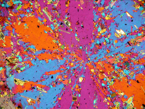 (A)は京都市東山のホルンフェルスの手標本で、灰色の基地中に六角形のガラスのような菫青石結晶が見える。母岩に埋まっているため、名前通りのスミレ色に見えない。(B・C・D)は瀬戸内海にある岩国市端島の菫青石の顕微鏡写真で、(B)は下方ニコルのみ、(C)は直交ニコル、(D)は直交ニコルに鋭敏色検板を入れた状態で写している。菫青石の三個の結晶が一個体になった三連透入双晶をなしているので、六弁の花びらが開いたように見える。学生の時に岩石図鑑で(D)の構図の写真を見て、自分もすぐに同様の写真を撮るつもりだったが、実際には何年もかかってやっとこの写真の薄片を1枚得られた(薄片の横幅約 3mm)。