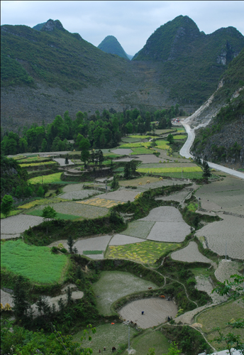 中国貴州省には石灰岩がとてつもなく広く分布しています。省都貴陽から一日中車に揺られて紫雲県にたどり着くまで、周囲はずーっと石灰岩です。石灰岩は、中〜古生代の古テチス海縁辺に発達した広大な陸棚上で炭酸塩プラットフォームとして形成されました。写真の山々は石炭紀〜ペルム紀境界付近の浅海成石灰岩でできています。湿潤モンスーン気候のため雨が多く、石灰岩は溶食され、山は尖っています。溶食されてできた小さな谷には所狭しと田畑がつくられています。牛や馬が大活躍です。