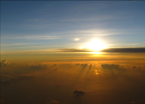 日本へ向かう太平洋上空高度10000メートル。機上から眺める夕陽に照らされる絶海の孤島が浮かび上がっていました。