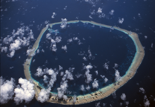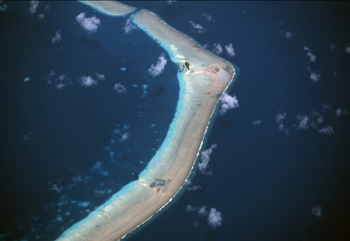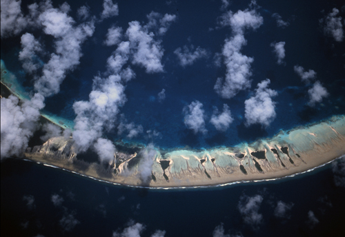パプアニューギニアの環礁, Takuu(Tauu)島は、南緯5度、東経157度に位置し、直径は約13.5kmあります(A)。写真(B)の中央の林の傍に集落が見えます。人口は約250人から2500人まで様々なデータがあり詳細は不明ですが、独特の言語や文化を持っています。大部分が満潮海水面から1−2mの低い島なので(C)、海面の相対的な上昇の影響が深刻で、農地の水没、地下水の海水化などにより数年前は食糧援助が、現在は移住が必要になっています。