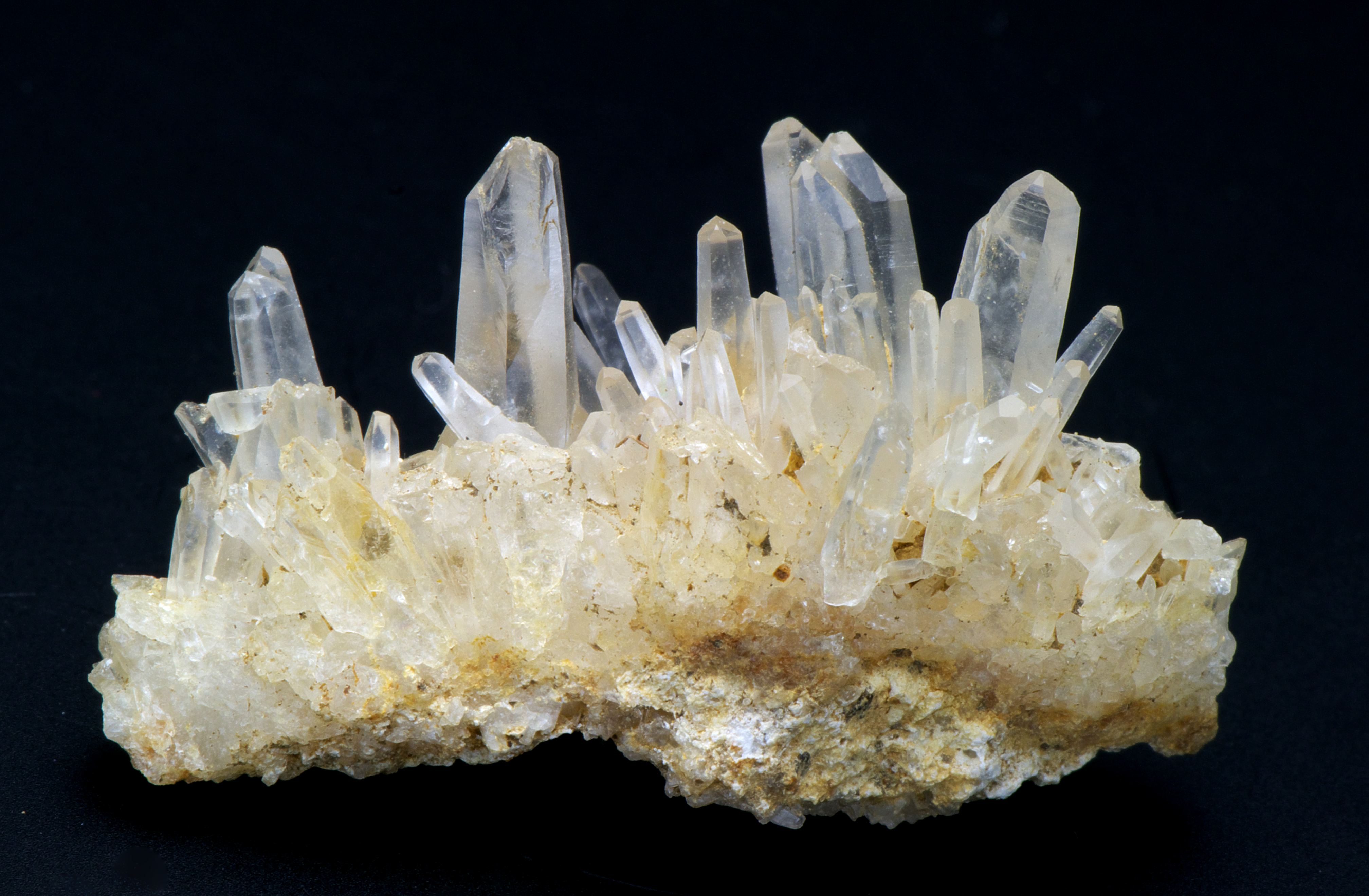 この水晶は、福島県郡山市西方の山中で、2008年6月1日に採集しました。 斜めに切った様な先端と、柱の面に年輪に似た無数の筋が現れているのが特徴です。 私が採集した中で一番形がよいです。小さな石ですが、大小の水晶がたくさん突き出ています。