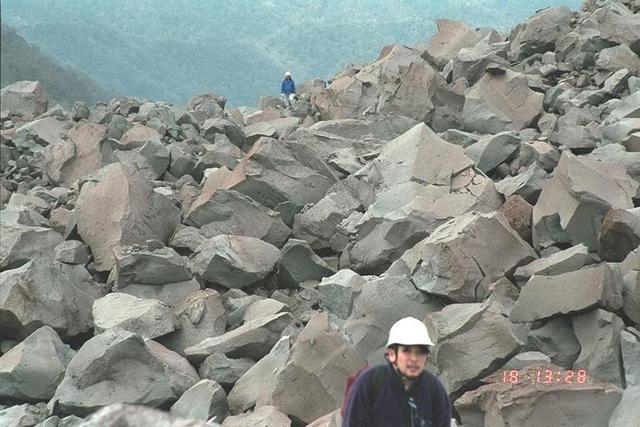 - Pile up of auto-brecciated lava near the summit area (left). Mafic inclusion in Heisei lava (right).