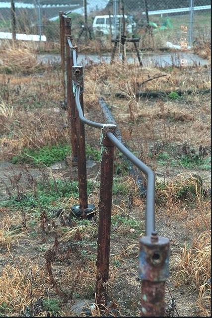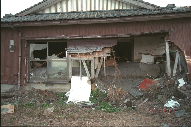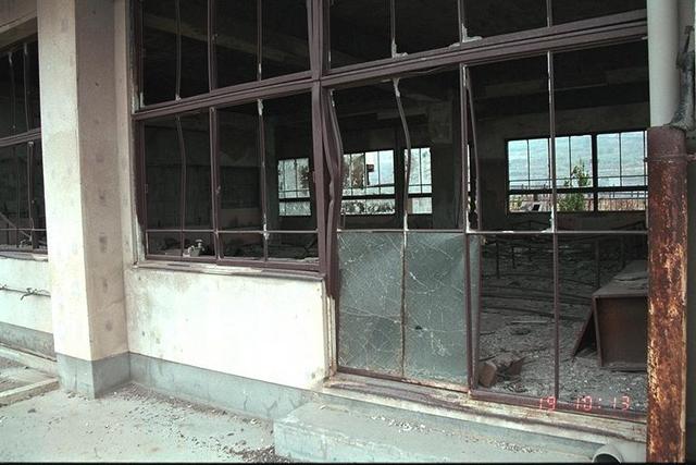 - Bent horizontal bars (left) and a damaged school building (right) of Oonokoba elementary school.