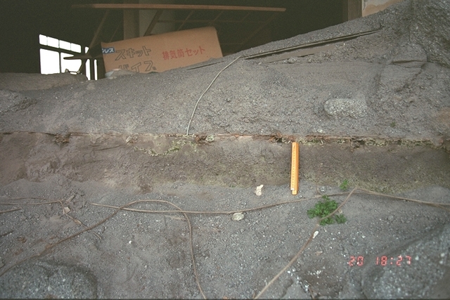 - Mud rain and ash fall deposit (10 A.M., May 28, 1991). - Volcanic ash produced by pyroclastic cloud sometimes fell down as mud rain. Video taken by Y. Kawanabe.