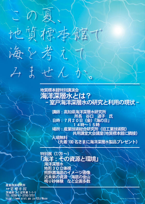 ポスターによる研究成果の紹介に加え,珍しい資料や映像をたくさん ご用意いたします.海の研究をぜひ体験してください.○海洋深層水の紹介