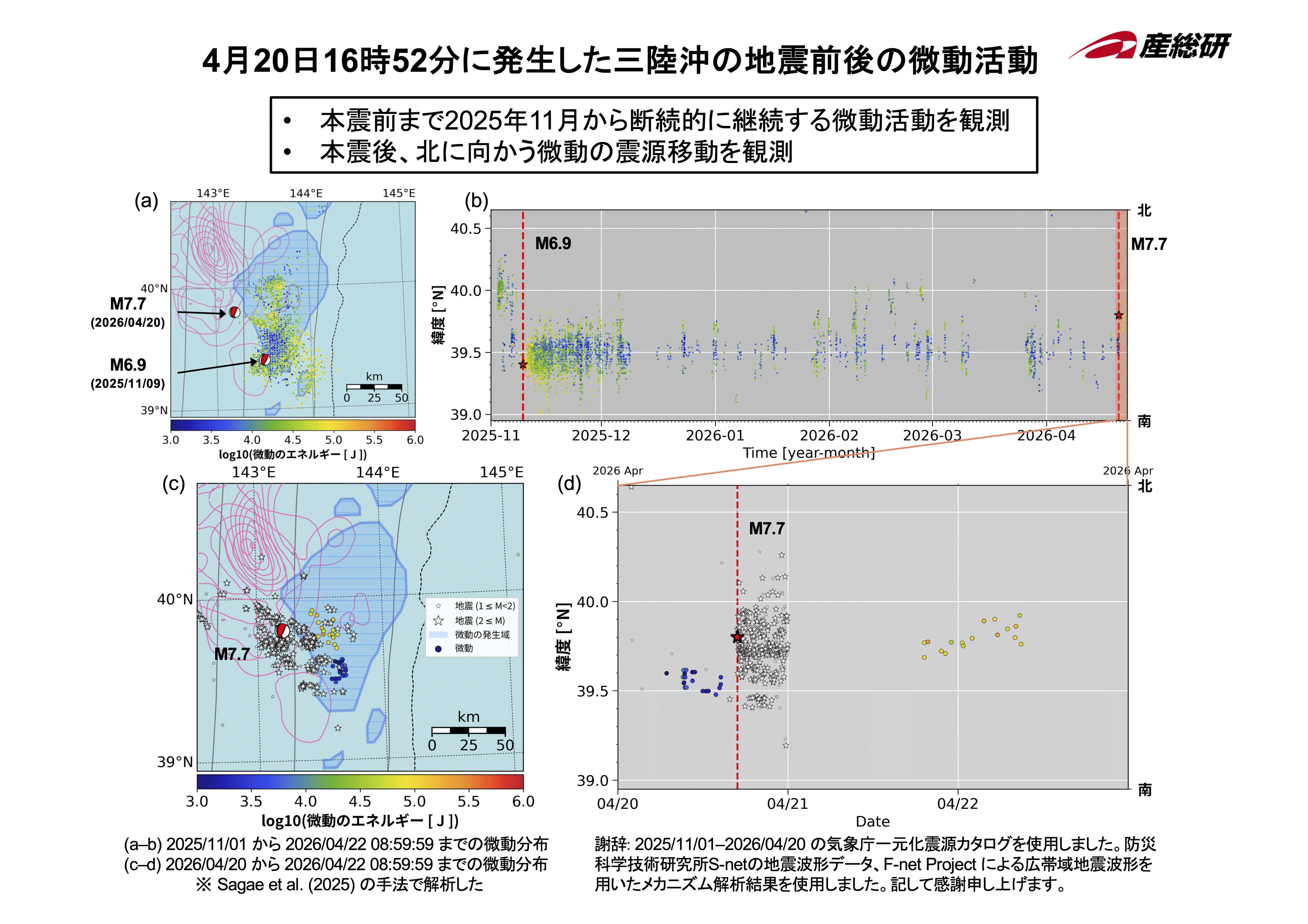 昨年11月9日の三陸沖の地震(M6.9)、12月8日の青森県東方沖の地震(M7.5)について、私たちはスロースリップを示唆する現象の一つである微動を検出しており、その活動を報告してきました(令和7年11月9日に発生した三陸沖の地震の関連情報、令和7年12月8日23時15分に発生した青森県東方沖の地震の関連情報)。本資料では、4月20日の三陸沖の地震前後でどのような微動活動が観測されていたかを報告します。