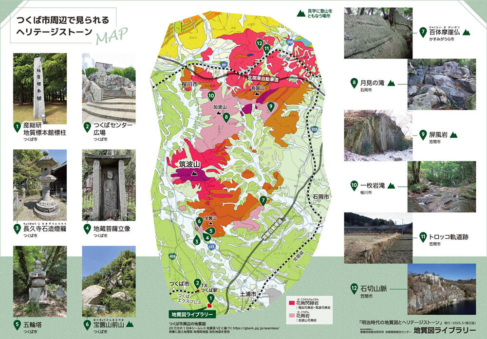 また、つくば市周辺で見学することのできる筑波山塊の花崗岩の石造物や露頭の一例を、「つくば市周辺で見られるヘリテージストーン」として紹介します。